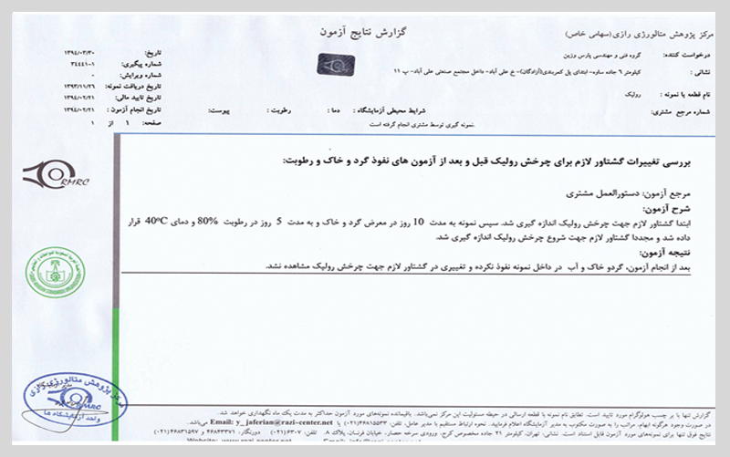 نمونه اولیه غلتکی برای آزمایش تره مورد نیاز به آزمایشگاه “رازی” منتقل شد و سپس نمونه اولیه به مدت 10 روز در محیطی پر از گرد و غبار قرار گرفت و سپس در یک اتاق در معرض رطوبت 80٪ و محیط 40 درجه سانتیگراد قرار گرفت. و یک بار دیگر از نظر میزان آن مورد آزمایش قرار گرفت و نتایج آزمایش به این ترتیب ثبت شد